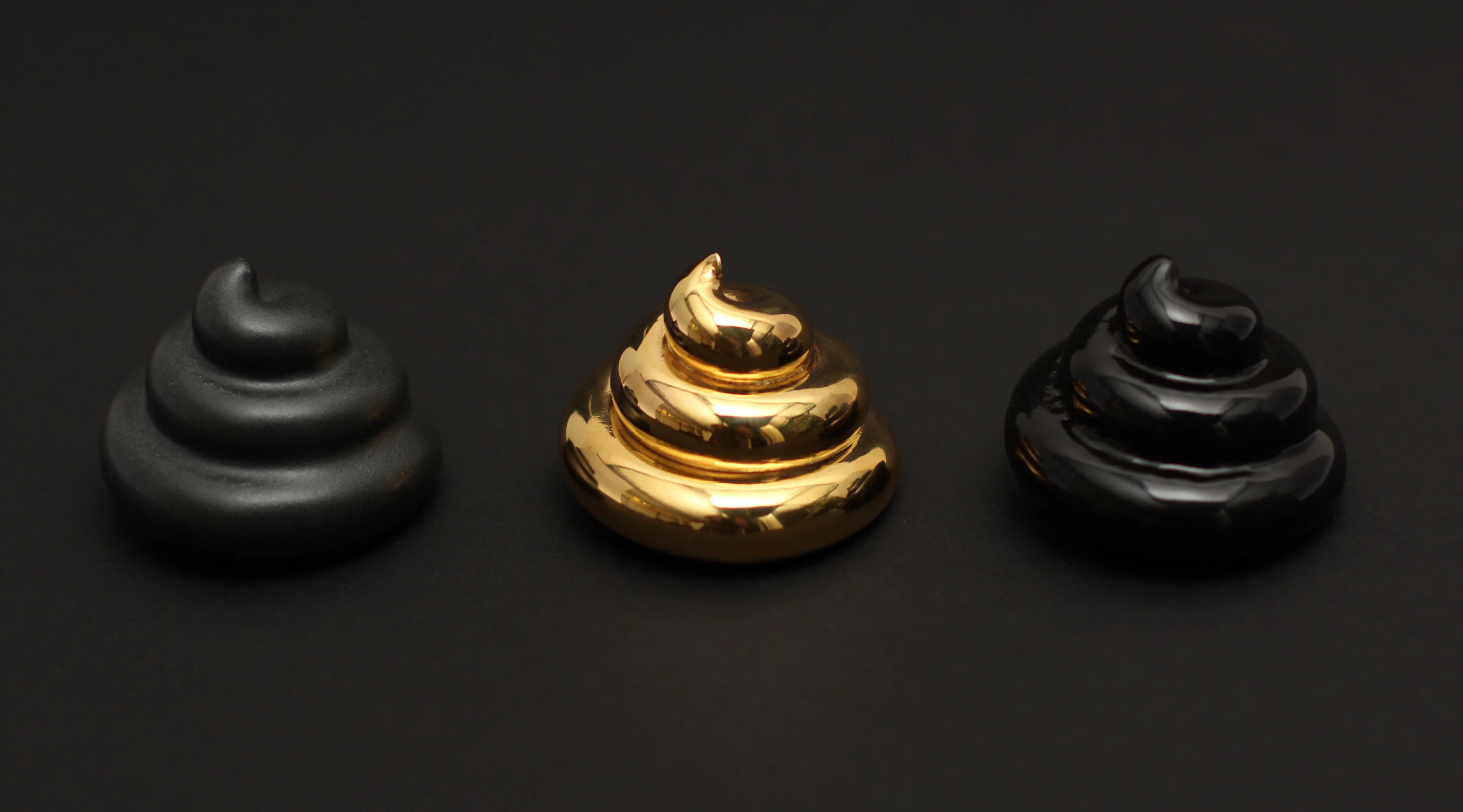 The premium turd is hand polished 18 carat gold plated brass. The other two are glazed porcelain, matte charcoal (dark grey) and glossy black.