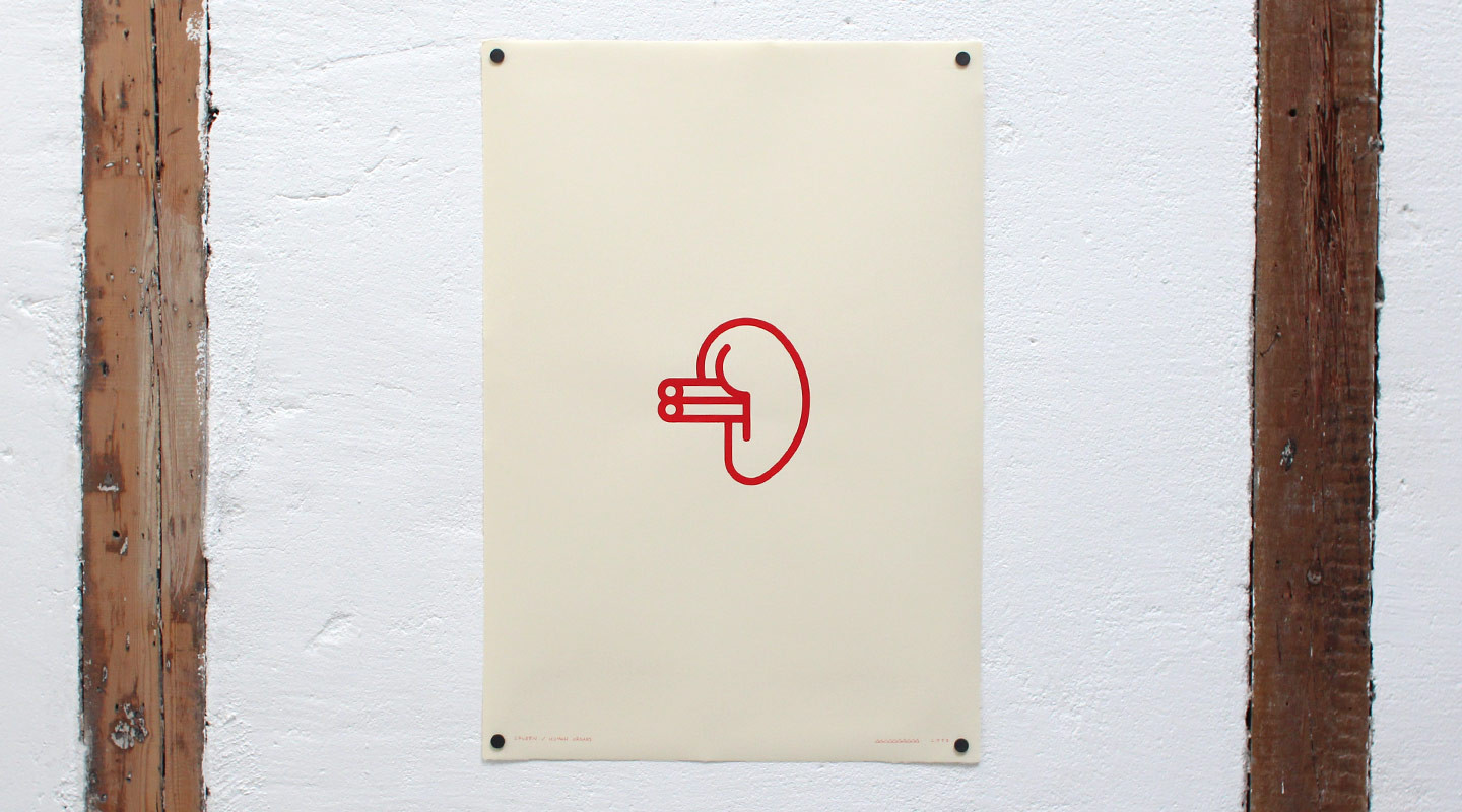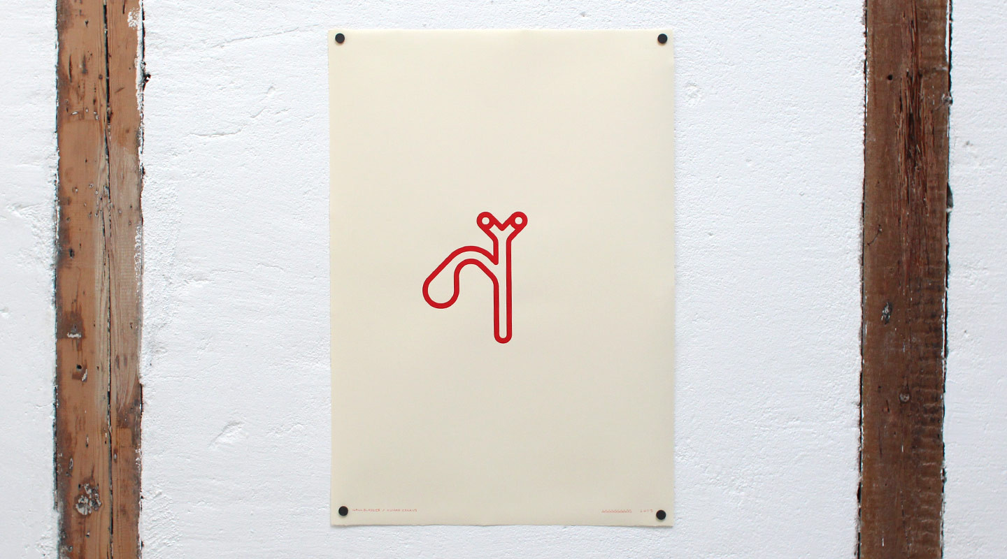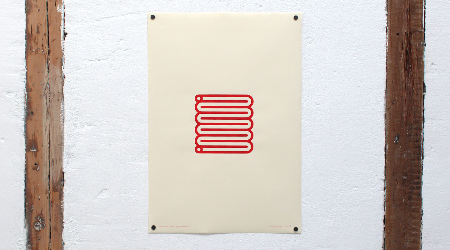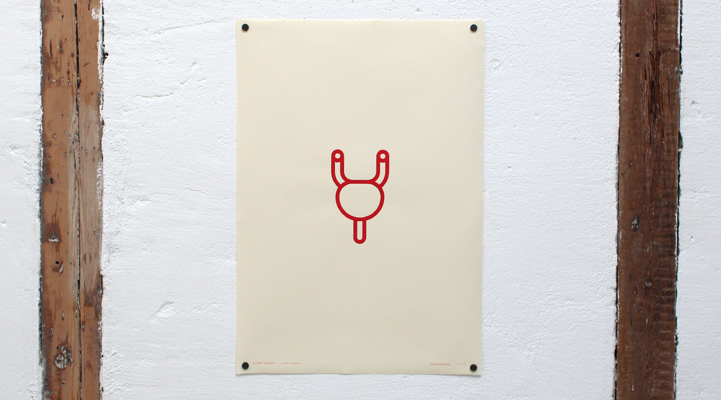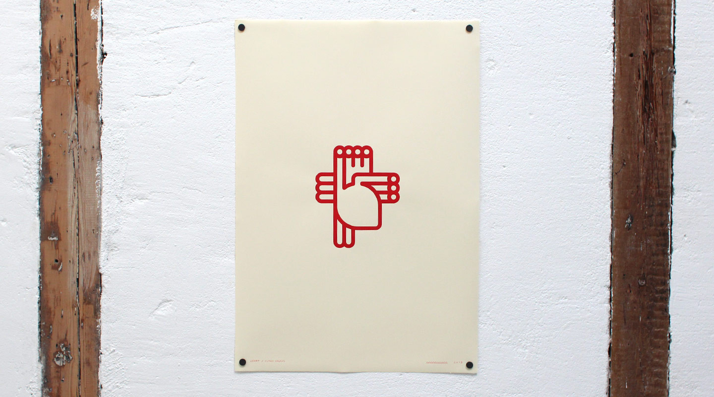 All posters are hand-crafted; painted in bright red acrylic on top of vinyl stencils. The paper is smooth 145g cream with slightly rough edges and measures 53 x 76,5 cm.