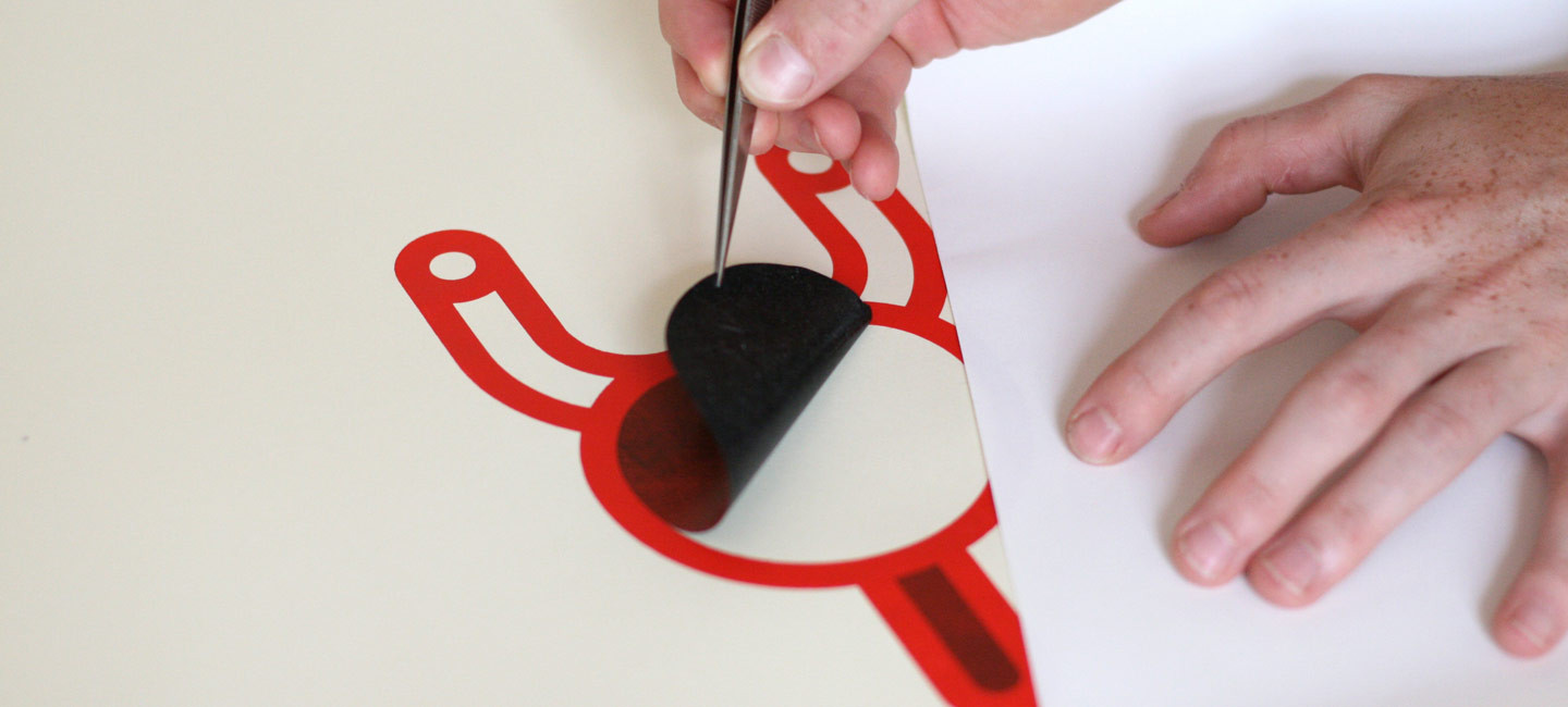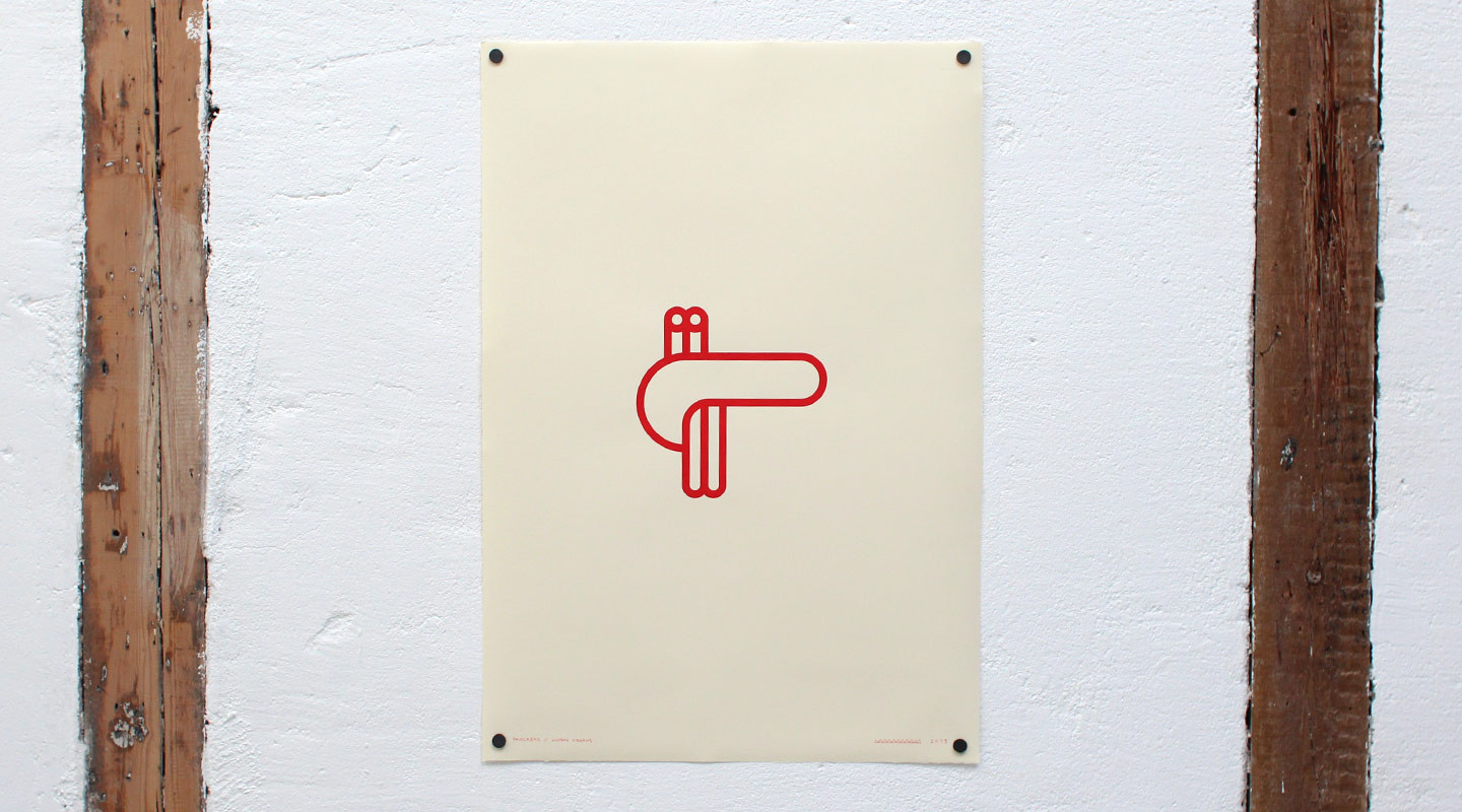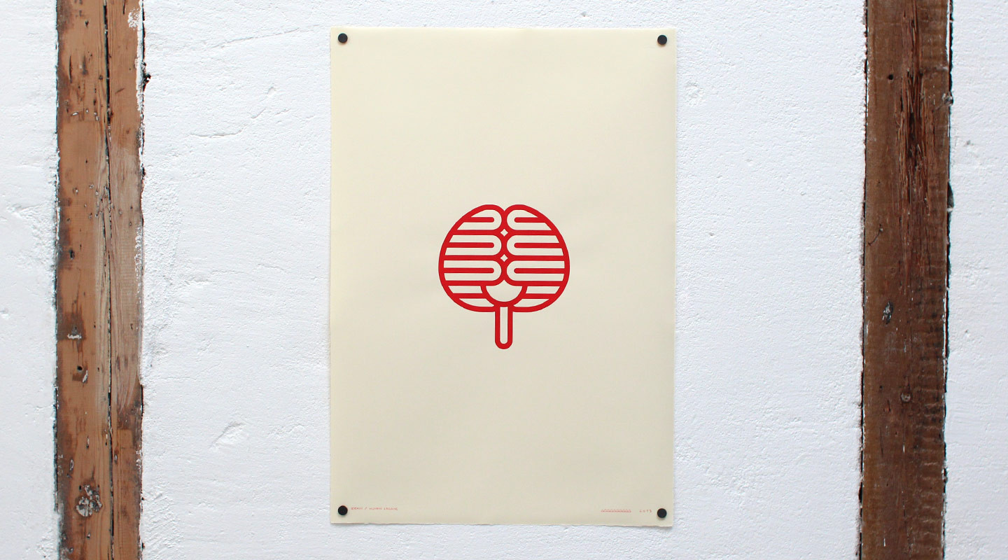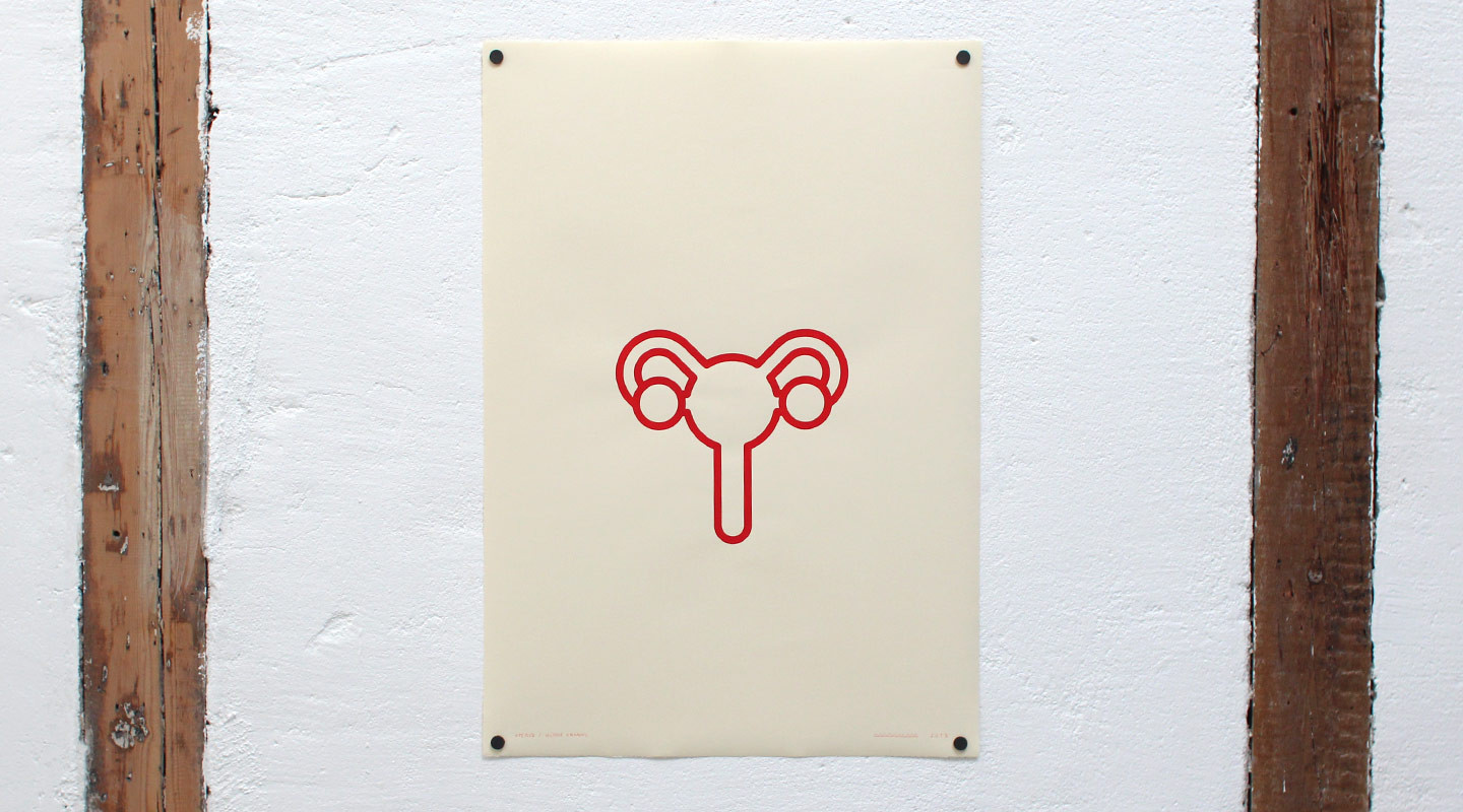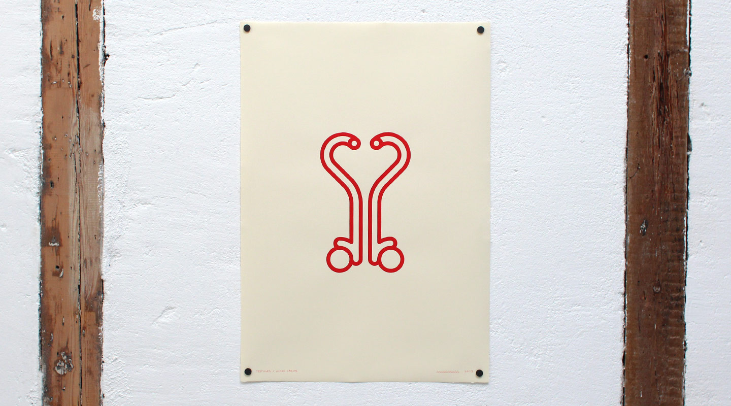 All posters are hand-crafted; painted in bright red acrylic on top of vinyl stencils. The paper is smooth 145g cream with slightly rough edges and measures 53 x 76,5 cm.