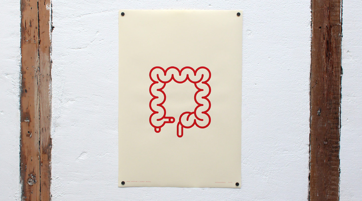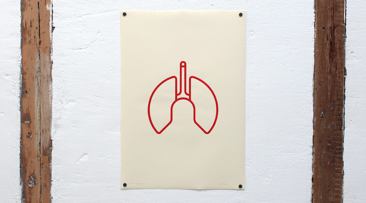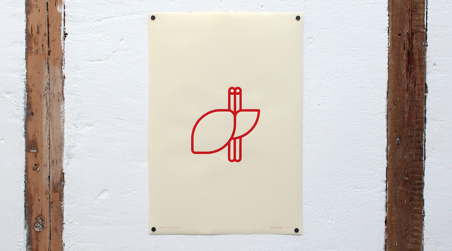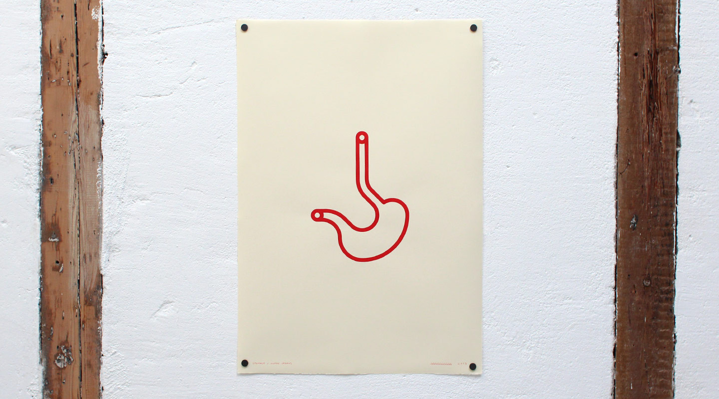 A hand-painted poster series of 14 geometrically stylized depictions of human anatomy. Each organ is one-off and signed.
